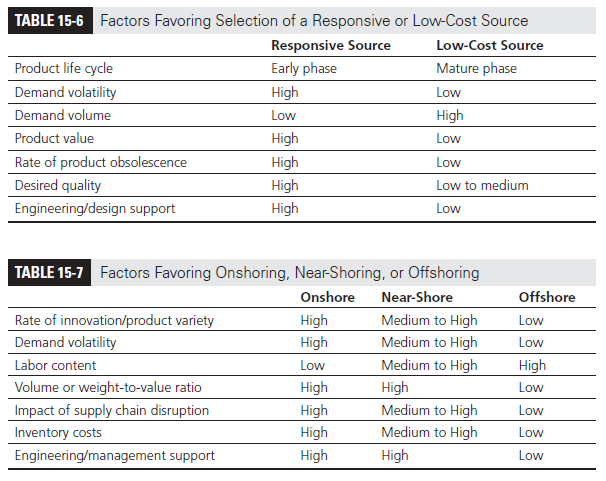 In general, responsive sources will tend to be located onshore or near-shore to facilitate a quick response. Low-cost sources could be located anywhere, but low cost is often the main reason for going offshore or near-shore. In Table 15-7, we identify some factors that influence the sourcing location decision.