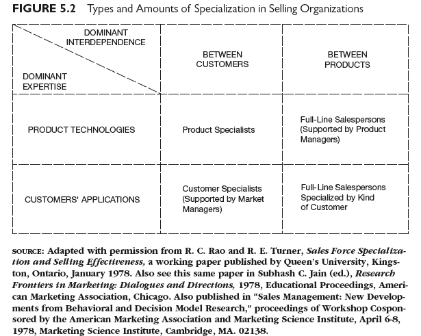 If the dominant interdependence is between customers (rather than between products), sales personnel should be specialists. They should be product specialists when the needed dominant expertise is in product technologies. They should be customer specialists when the needed dominant expertise is in customers’ applications. Customer specialists need the support of market managers who provide the needed prospect expertise through their specialization in applications in particular industries.