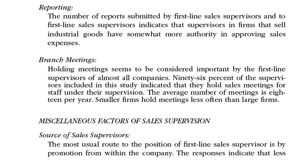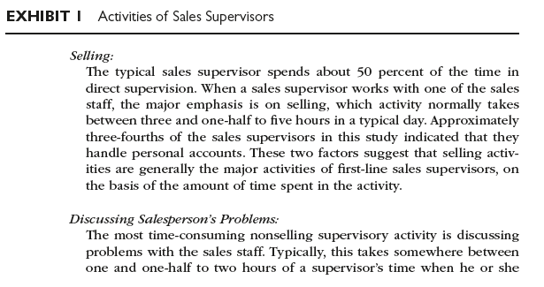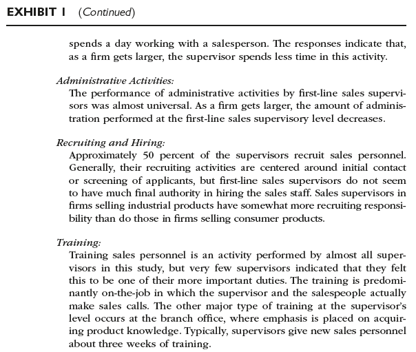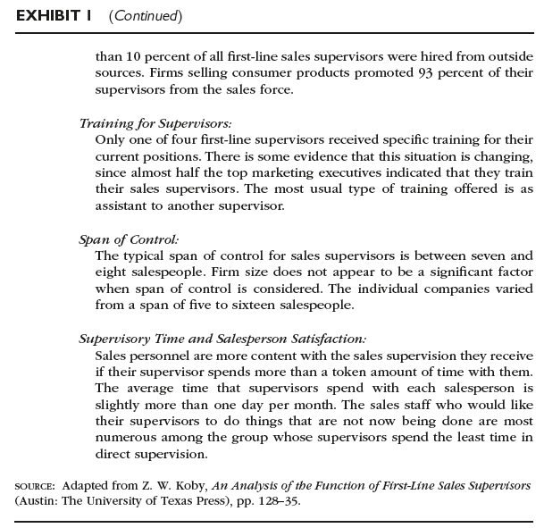 Recently, Gary Graydon was asked to cooperate in a national study of sales supervisors by Z. William Koby of Houston, Texas. One purpose of the study was to assess the role of first-line supervisors in American sales organizations. The Dewey Dressing Company was one of twenty-one large national organizations that participated in the study. A year later, Graydon received a summary of the results from Koby. These results were based upon detailed responses from top marketing executives, sales supervisors, and sales personnel. There were approximately 300 responses from supervisors and 1,500 from salespeople. Summarized extracts from this report are shown in Exhibit 1. Fifteen of the firms were industrial-goods manufacturers; the rest were consumer-goods manufacturers.