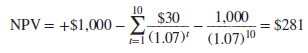 NPV =-$1,000 + PV of interest payments at 7% of $1,000 + PV of principal ($1,000 repaid in year 10)