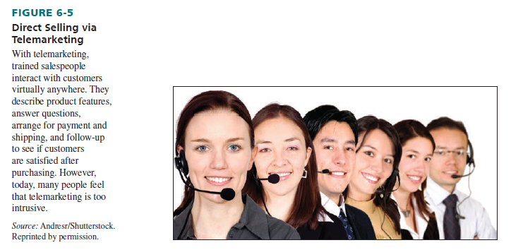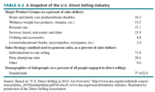 Direct selling includes both personal contact with consumers in their homes (and other nonstore locations such as offices) and phone solicitations initiated by a retailer. See Figure 6-5. Cosmetics, jewelry, vitamins, household goods and services (such as carpet cleaning), vacuum cleaners, and magazines and newspapers are among the items sometimes sold in this way. The industry has $35 billion in annual U.S. sales and employs more than 18.2 million people (more than 90 percent of whom work part time). Annual foreign direct-selling revenues are an additional $185 billion, generated by more than 100 million salespeople.12 Table 6-2 shows a U.S. industry overview.