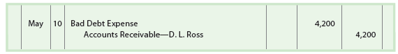 To illustrate, assume that on May 10 a $4,200 account receivable from D. L. Ross has been determined to be uncollectible. The entry to write off the account is as follows: