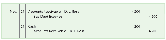 To illustrate, assume that the D. L. Ross account of $4,200 written off on May 10 is later collected on November 21. The reinstatement and receipt of cash is recorded as follows: