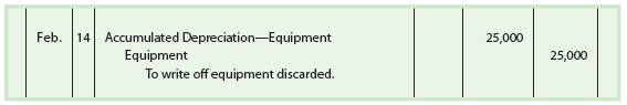 To illustrate, assume that equipment acquired at a cost of $25,000 is fully depreciated at December 31, 2013. On February 14, 2014, the equipment is discarded. The entry to record the discard is as follows:
