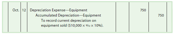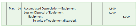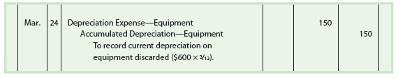 If an asset has not been fully depreciated, depreciation should be recorded before removing the asset from the accounting records. To illustrate, assume that equipment costing $6,000 with no estimated residual value is depreciated at a straight-line rate of 10%. On December 31, 2013, the accumulated depreciation balance, after adjusting entries, is $4,650. On March 24, 2014, the asset is removed from service and discarded. The entry to record the depreciation for the three months of 2014 before the asset is discarded is as follows: