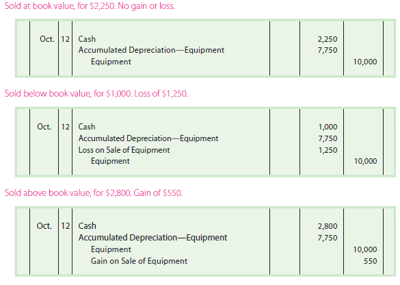 After the current depreciation is recorded, the book value of the asset is $2,250 ($10,000 − $7,750). The entries to record the sale, assuming three different selling prices, are as follows: