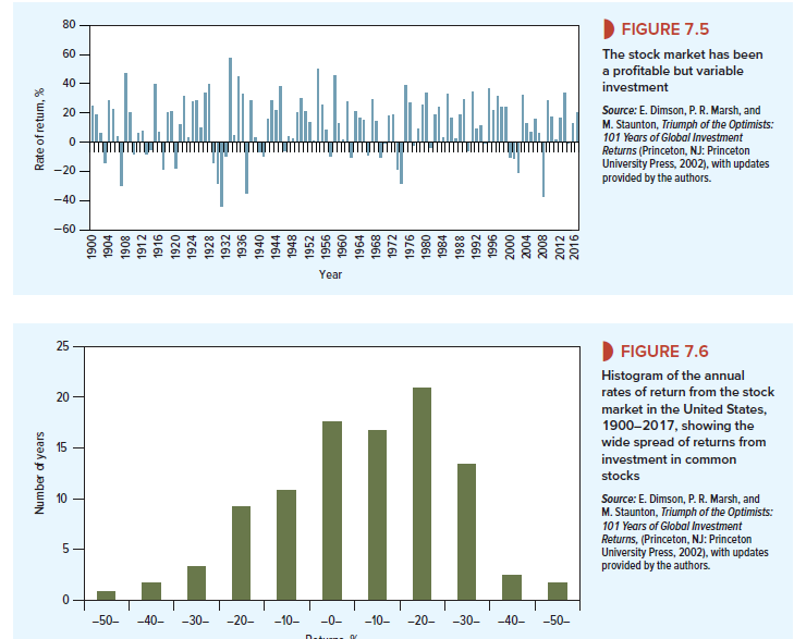 Another way to present these data is by a histogram or frequency distribution. This is done in Figure 7.6, where the variability of year-to-year returns shows up in the wide “spread” of outcomes.