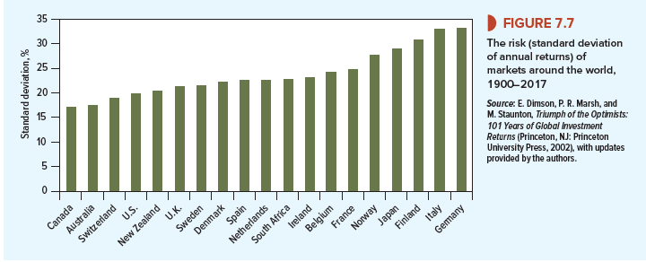 Figure 7.7 compares the standard deviation of stock market returns in 20 countries over the same 118-year period. Portugal occupies high field with a standard deviation of 38.8%, but most of the other countries cluster together with percentage standard deviations in the low 20s.