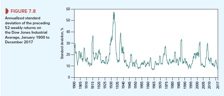 Figure 7.8 does not suggest a long-term upward or downward trend in the volatility of the U.S. stock market.19 Instead there have been periods of both calm and turbulence. In 1995, an unusually tranquil year, the standard deviation of returns was less than 8%. Later, in the financial crisis, the standard deviation spiked at over 40%. By 2017, it had dropped back to its level in 1995.