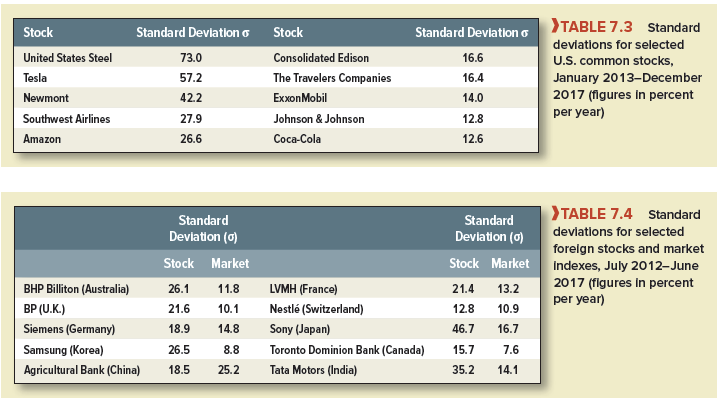 Take a look also at Table 7.4, which shows the standard deviations of some well-known stocks from different countries and of the markets in which they trade. Some of these stocks are more variable than others, but you can see that once again the individual stocks for the most part are more variable than the market indexes.