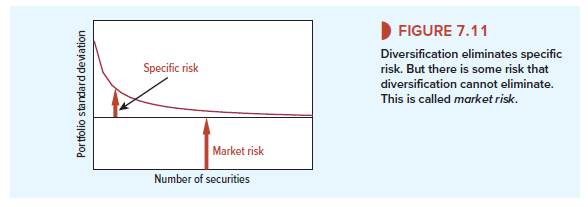 In Figure 7.11, we have divided risk into its two parts—specific risk and market risk. If you have only a single stock, specific risk is very important; but once you have a portfolio of 20 or more stocks, diversification has done the bulk of its work. For a reasonably well-diversified portfolio, only market risk matters. Therefore, the predominant source of uncertainty for a diversified investor is that the market will rise or plummet, carrying the investor’s portfolio with it.
