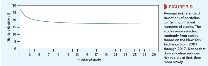For investors, even a little diversification can provide a substantial reduction in variability. Suppose you calculate and compare the standard deviations between 2007 and 2017 of one- stock portfolios, two-stock portfolios, five-stock portfolios, and so forth. You can see from Figure 7.9 that diversification can cut the variability of returns by about a third. Notice also that you can get most of this benefit with relatively few stocks: The improvement is much smaller when the number of securities is increased beyond, say, 20 or 30.