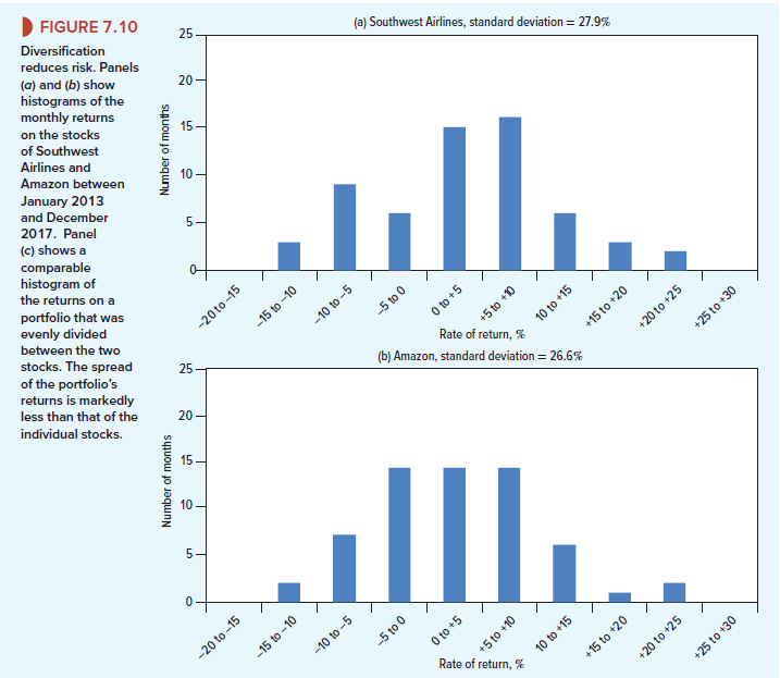Diversification works because prices of different stocks do not move exactly together. Statisticians make the same point when they say that stock price changes are less than perfectly correlated. Look, for example, at Figure 7.10. Panels (a) and (b) show the spread of monthly returns on the stocks of Southwest Airlines and Amazon. Although the two stocks enjoyed a fairly bumpy ride, they did not move in exact lockstep. Often a decline in the value of one stock was offset by a rise in the price of the other.21 So, if you had split your portfolio evenly between the two stocks, you could have reduced the monthly fluctuations in the value of your investment. You can see this from panel (c), which shows that if your portfolio had been evenly divided between the two stocks, there would have been many more months when the return was just middling and far fewer cases of extreme returns.