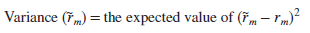 The standard statistical measures of spread are variance and standard deviation. The variance of the market return is the expected squared deviation from the expected return. In other words,