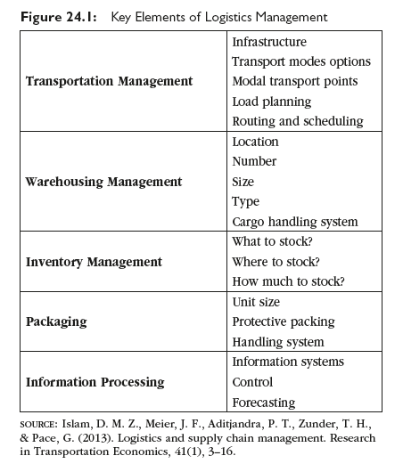 The objective of logistics management is to facilitate an efficient transportation or timely movement of products from one place to another with optimum inventory level consistent with customer service goals at lowest possible total logistics cost. The Council of Logistics Management (1998) defines logistics as, “the process of planning, implementing, and controlling the efficient, effective flow and storage of goods, services, and related information from the point of origin to the point of consumption for the purpose of conforming to customer requirements. Note that this definition includes inbound, outbound, internal and external movements, and the return of materials for environmental purposes.”7 The elements of logistics management are transportation management, warehousing management, inventory management, packaging, and information processing (Figure 24. 1).