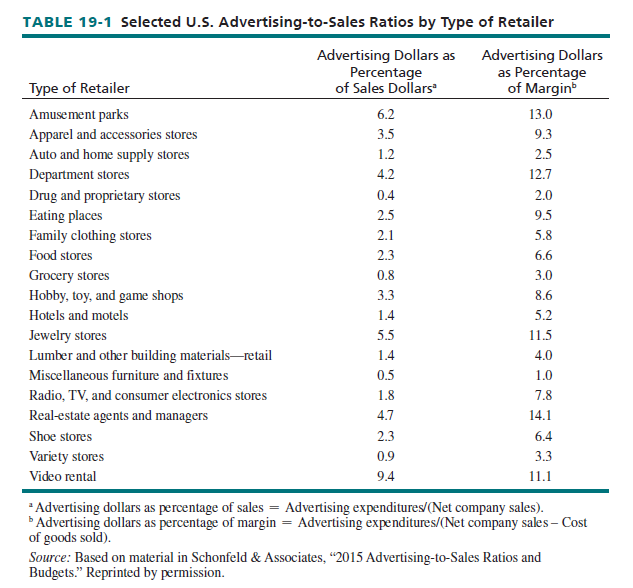 Amazon has the highest annual dollar advertising expenditures among U.S. retailers—nearly $4 billion. However, this represents just 3.5 percent of U.S. sales. Amazon relies on targeted online advertising, television advertising, public relations, its Associates program (where participants get commissions when their customer referrals result in product sales), cooperative advertising with vendors, and price promotions such as percentage discounts off current purchases and inducement offers for discounts on future purchases subject to a minimum current purchase.3 Table 19-1 shows advertising ratios for several retailing categories.