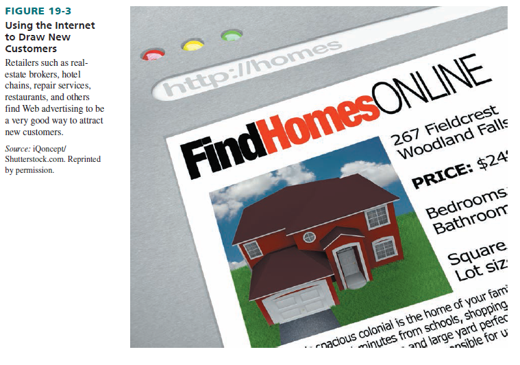 From an advertising perspective, online retailers use Web ads to stimulate awareness and E-commerce. For store retailers, the Web provides information to customers about locations, describes products carried, lets people order catalogs, and so forth. Retailers have two opportunities to reach customers: advertising on search engines and other firms’ Web sites; and communicating with customers at their own sites. Web-based advertising has been growing at a fast pace—and will continue to do so for the foreseeable future. See Figure 19-3.