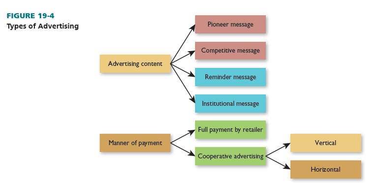 TYPES Advertisements can be classified by content and payment method. See Figure 19-4. Pioneer ads have awareness as a goal and offer information (usually on new firms, products, or locations). Competitive ads have persuasion as a goal. Reminder ads are geared to loyal customers and stress attributes that have made retailers successful. Institutional ads seek to keep retailer names before the public without emphasizing the sale of goods or services. Public service messages are institutional.
