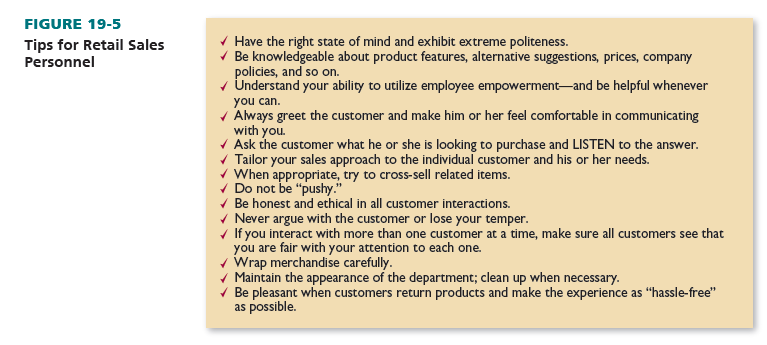 Customer-service-oriented retailers believe in training superior sales associates. Why? First, higher levels of selling are needed to reinforce the retailer’s image as customer-centric. Unlike self-service discounters, full-service retailers want their sales staff to frequently interact with and advise customers. Second, many retailers want to stimulate cross-selling, whereby associates recommend related items to customers. Third, sales associates may be able to “save the sale” by suggesting that customers who return merchandise try different colors, styles, or quality. And last, salespeople can help foster customer loyalty. Figure 19-5 highlights sales associate tips.
