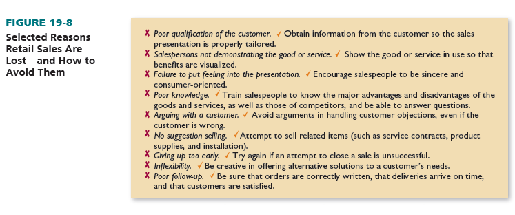 For personal selling to work well, salespeople must be enthusiastic, knowledgeable, interested in customers, and good communicators. Figure 19-8 cites several ways that retail sales can be lost through poor personal selling and how to avoid these problems.8