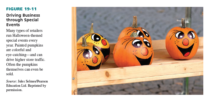Retailers may use special events to generate consumer enthusiasm. Events can range from store grand openings to fashion shows. When new McDonald’s stores open, there are typically giveaways and children’s activities, and there is a guest appearance by Ronald McDonald (a human in a costume). Generally, in choosing a special event, the potential increase in consumer awareness and store traffic needs to be weighed against that event’s costs. See Figure 19-11.