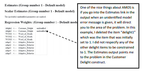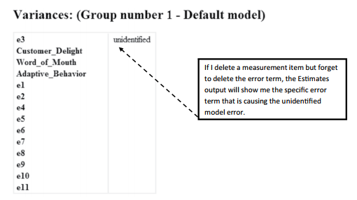 This unidentified model means you are trying to estimate more parameters than observations. This can often be caused by including too many relationships or covariances in your model. Among the more likely reasons for this message is that you failed to set the metric with one of your items in a construct, or you have deleted an item from a construct and that specific item was set to “1” to set the metric for the construct. Once you have deleted the item and not set another indicator to 1, AMOS will give you an unidentified model error message. Another reason for an unidentified model error could be that you deleted an indicator but failed to delete the corresponding error term.The error term is essentially a stand-alone construct still in the model. This will also prompt an unidentified model error message.