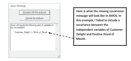 - Missing covariance message—all independent variables need to have a covariance If you forget to add the covariance between constructs, AMOS will give you a warning message that two independent constructs are not correlated. AMOS will let you proceed with the analysis without adding a covariance between the constructs, but the majority of the time you will need to include the missing covariance.