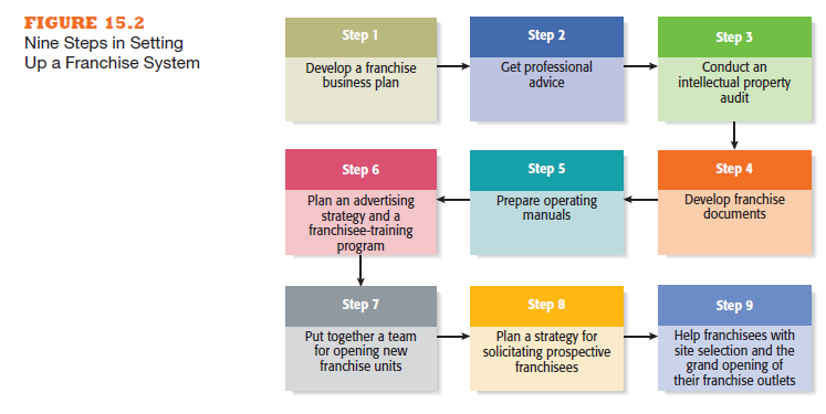 Let’s assume that as an entrepreneur you have decided to use franchising as a means of growing your venture. What steps should you take to develop a fran- chise system? As illustrated in Figure 15.2, you, as an entrepreneur, should take nine steps in order to successfully set up a franchise system.