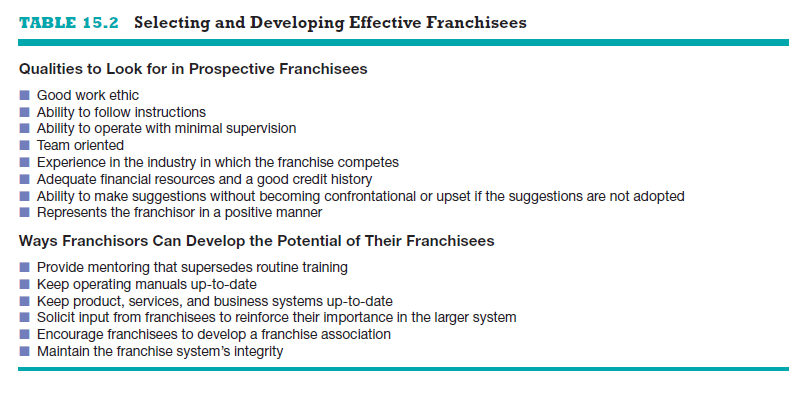 Once franchisees are selected, it is important that franchisors work to de- velop their franchisees’ potential. Table 15.2 contains a list of the qualities that franchisors look for in prospective franchisees and the steps that franchisors can take to develop their franchisees’ potential.