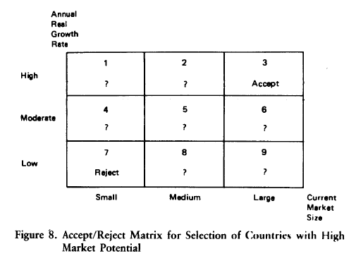 In practice, company managers would assign specific percentages to the three growth categories in Figure 8 and specific dollar or quantity amounts to the three size categories. If a country were to fall in cell 3, it would be clearly acceptable as a high-market-potential country, because it offers a large, high-growth market. Conversely, if a country were to fall in cell 7, it would be clearly unacceptable as a high-market-potential country. But what about countries falling in the other cells? The accept/reject designation of these cells would depend on the growth/size trade-off established by company managers, a conditionality indicated by question marks. If, for exam-pie, large market size were deemed very important, then managers might accept a country falling in cell 9, despite its low growth. On the other hand, if high growth were deemed critical, managers would reject a country falling in cell 9 but accept a country falling in cell 1, despite its small market size. In short, there are no absolute accept/reject standards; the accept/reject rule is itself a management decision. Whatever the rule used by managers, we assume in this exposition that certain countries are accepted as high-market-potential countries (say, 5 in number). The next stage in the selection of a foreign target market is to estimate the sales potentials for the company’s own product in those countries.