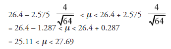By this, we understand that the true value of fl, the population mean, lies somewhere between 25.42 and 27.38 and that we can be 95 percent confident in accepting this.