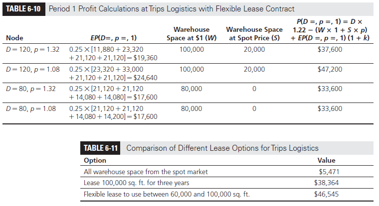 The manager next evaluates the alternative whereby the lease for 100,000 sq. ft. of warehouse space is signed. The evaluation procedure is very similar to that for the previous case, but the outcome changes in terms of profit. For example, at the node D = 144, p = 1.45, the manager will require 44,000 square feet of warehouse space from the spot market at $1.45 per square foot because only 100,000 square feet have been leased at $1 per square foot. If demand happens to be less than 100,000 units, Trips Logistics still has to pay for the entire 100,000 square feet of leased space. For Period 2, the manager obtains the profit at each of the nine nodes, as shown in Table 6-7.