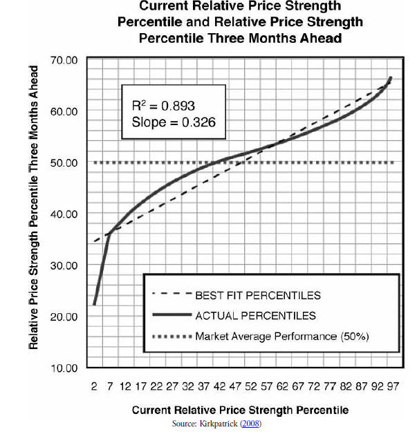 FIGURE 21.11 Relative three-month performance of stocks selected by relative price strength using the Kirkpatrick (2008) method