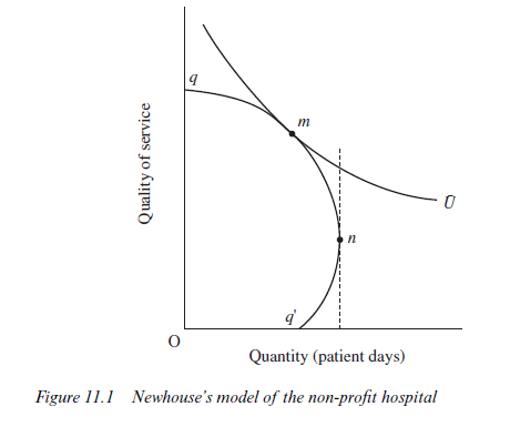 Newhouse’s model of the non-profit hospital is in this tradition. In Figure 11.1, the constraint qq’ represents combinations of quantity and quality of service that can be offered while permitting the hospital to break even. At low levels of quality, demand for the hospital’s services is oq’. Higher quality raises costs, but it also results in a rise in quantity demanded over a certain range. An administrator wishing to maximise demand for the hospital’s services would pick point n on the constraint. Beyond this point, further increases in quality cause quantity demanded to fall. Higher quality is assumed to increase demand, but this effect is outweighed by the consequential rise in prices. If medical staff trade off quality against quantity in the way indicated in Figure 11.1 they will choose a point such as m.