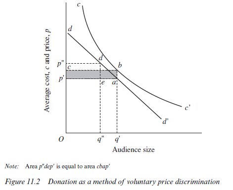 Supposing, however, that the company finds it impossible, even by introducing gradations of comfort and social status, to discriminate sufficiently between people to cover its costs; voluntary donations might still enable a production to take place. Donations, in other words, function as a voluntary system of price discrimination. By revealing their high willingness to pay for live theatre performances, donors help to finance the overhead costs which are strictly joint to all the audience members. Non-profit status encourages such donations because it ensures that money is used to lower seat prices or finance the costs of performance and is not distributed as profit.