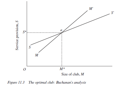 Figure 11.3 summarises the above argument. Curve SS’ traces the chosen level of service provision at each club size. Curve MM’ traces the chosen club size for each level of service provision. If existing members do not wish to change the level of provision or the membership size, the club is operating at its optimal point. This is point a in Figure 11.3, with membership M* and service level S*. As we saw with worker-owned firms, decision-making costs will be much lower if the club has a fairly homogeneous membership. Further, there will be a tendency for clubs to cater for particular income levels. Rich people will be dissatisfied with the level of service provision if other club members are much poorer, whilst the poorer members will chafe at the fees imposed in rich clubs.18