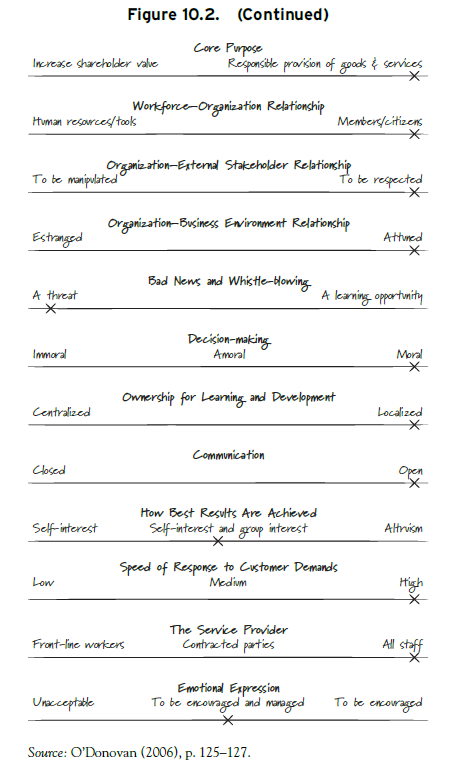 A second example is the detailed analysis of a corporate culture change program conducted in HSBC in Hong Kong (O’Donovan, 2006). I will give some of the change process details in Chapter Seventeen , but for purposes of this chapter, it is relevant to examine what dimensions of culture were used in this change program. O ’ Donovan started with Schein’s hypothesized set of dimensions of what an innovative culture would look like and added several dimensions of her own to create the twenty-three dimensions shown in Figure 10.2 (Schein, 1990). It is important to note that the Xs on each dimension show the optimum position on that dimension for innovation and learning, which means that on some dimensions, a middle position is more desirable than an extreme position.