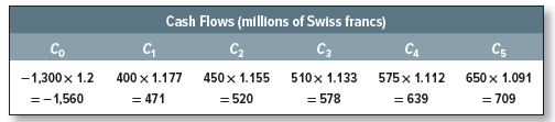 To convert this net present value to Swiss francs, the manager can simply multiply the dollar NPV by the spot rate of exchange. For example, if the spot rate is CHF1.2/$, then the NPV in Swiss francs is