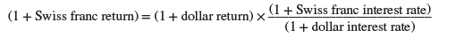 These cash flows are in Swiss francs and therefore they need to be discounted at the risk- adjusted Swiss franc discount rate. Since the Swiss rate of interest is lower than the dollar rate, the risk-adjusted discount rate must also be correspondingly lower. The formula for converting from the required dollar return to the required Swiss franc return is[2]