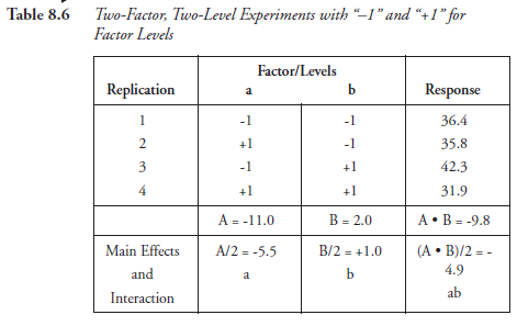 The values of A, B, and A • B were derived using all four response values. The experiment yielding these responses could be formulated as y = f (a, b), wherein y gives the responses (the dependent variables), and a and b are two factors (independent variables) acting together. The effect of a on y, for instance, was tested for at two levels, a1 and a2, each requiring one replication. This means that two replications were necessary, yielding responses, to study the effect of a once. Four responses tested, thus, gives the effect of a, 4 ÷ 2 = 2 times. So, the main effect of a is obtained by dividing A by 2. The last row ofTable 8.6, thus, shows the main effect of a, that of b, and the interaction of a and b, respectively, symbolized as a, b, and ab.