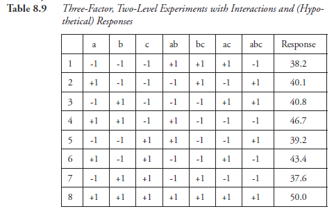 Among a, b, and c, we get the interactions ab, bc, ac, and abc. We may now extend the above table to include a column for each of these four interactions. As for the “—1” and “+1” signs required corresponding to each of these columns, a simple multiplication rule is all that is needed. For instance, in the third row of Table 8.8, we find a with “—1,” b with “+1,” and c with “—1” signs. On the same row, thus, ab will get a “—1” sign, as (—1) x (+1) = —1; bc will also get a “—1” sign, as (+1) x (—1) = —1; ac will get a “+1” sign, as (—1) x (—1) = +1; and abc will get a “+1” sign, as (—1) x (+1) x (—1) = +1. Working out such details can be done without the need for any further information. The data in Table 8.9 shows this method applied to all the eight rows.