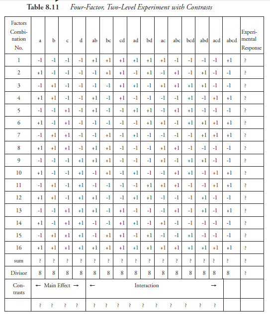 Now, if we have the numerical values of the responses obtained by experimentation, corresponding to each of the sixteen factor combinations, we can create a column next to the matrix, as shown in Table 8.11. The values of the main effect of the four factors and eleven interactions, together with fifteen contrasts, can each be evaluated simply by adding the sixteen products obtained by multiplying “—1” or “+1” in a given row of the column to the corresponding response value on the same row. In place of each response and each contrast, the values of these being unknown, a “?” mark is registered.
