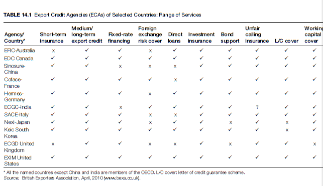 ECAs differ in their goals, magnitude, and types of services. All offer medium- and long-term credits. They also provide other products and services such as short-term export credits, letter of credit guarantees, and bond unfair calling. (see Table 14.1).