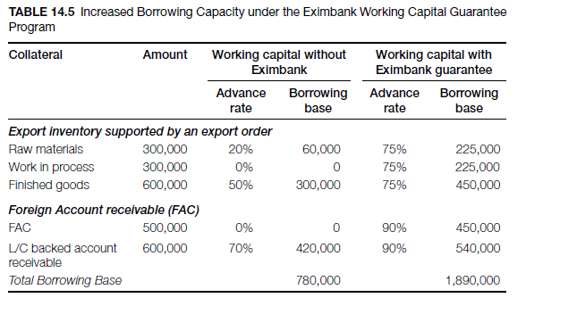 Exporters can borrow up to 75 percent of their inventory, including work-in-process, and up to 90 percent of their foreign account receivable, thus increasing their borrowing capacity. Table 14.5 illustrates borrowing capacity with and without the working capital facility.
