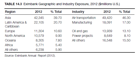 Annual authorizations have ranged from $14 billion (2008) to $36 billion in 2012 (see Tables 14.3 and 14.4). The largest share of the Bank portfolio involves financing infrastructure projects such as transportation, power generation, oil and gas production, and mining. The highest geographic exposure is in Asia, with almost 40 percent of the total. Eximbank also has enhanced financing available for certain categories of exports: environmentally beneficial goods and services, medical equipment, and transportation security equipment.