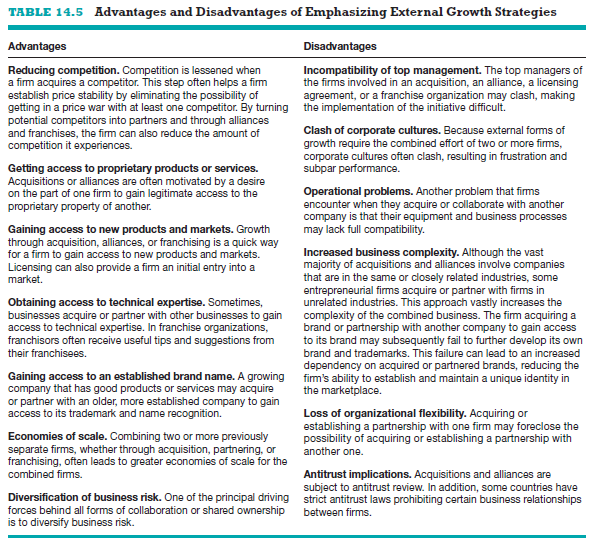 There are distinct advantages and disadvantages to emphasizing external growth strategies, as shown in Table 14.5.