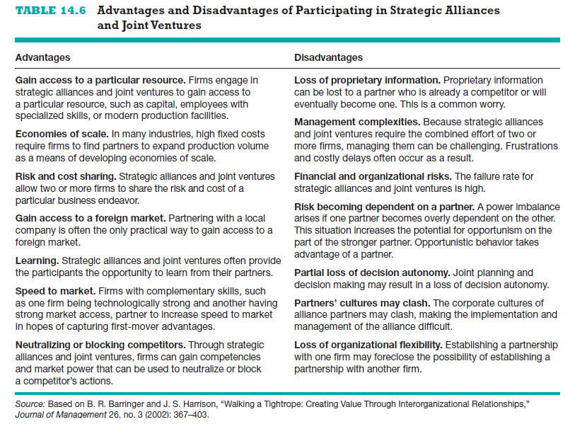The increase in the popularity of strategic alliances and joint ventures has been driven largely by a growing awareness that firms can’t “go it alone” and suc- ceed.19 As with all forms of firm growth, strategic alliances and joint ventures have advantages and disadvantages. We present these points in Table 14.6.