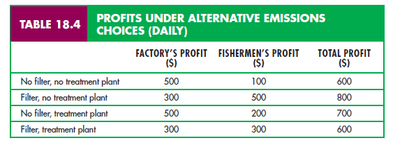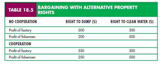 Suppose the factory and the fishermen agree to split this gain equally by having the fishermen pay the factory $250 to install the filter. As Table 18.5 shows, this bargaining solution achieves the efficient outcome. Under the column “Right to Dump,” we see that without cooperation, the fishermen earn a profit of $200 and the factory $500. With cooperation, the profit of both increases by $50.