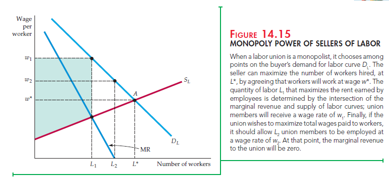 Figure 14.15 shows a demand for labor curve in a market with no monopsony power: It aggregates the marginal revenue products of firms that compete to buy labor. The labor supply curve describes how union members would supply labor if the union exerted no monopoly power. In that case, the labor market would be competitive, and L* workers would be hired at a wage of w*, where demand DL equals supply SL.