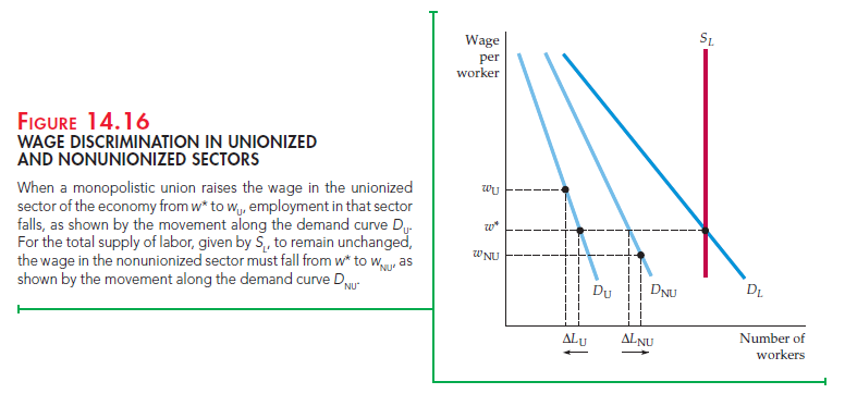 Assume that the total supply of unionized and nonunionized workers is fixed. In Figure 14.16, the market supply of labor in both sectors is given by SL. The demand for labor by firms in the unionized sector is given by D , the demand in the nonunionized sector by DNU. Total market demand is the horizontal sum of the demands in the two sectors and is given by D.